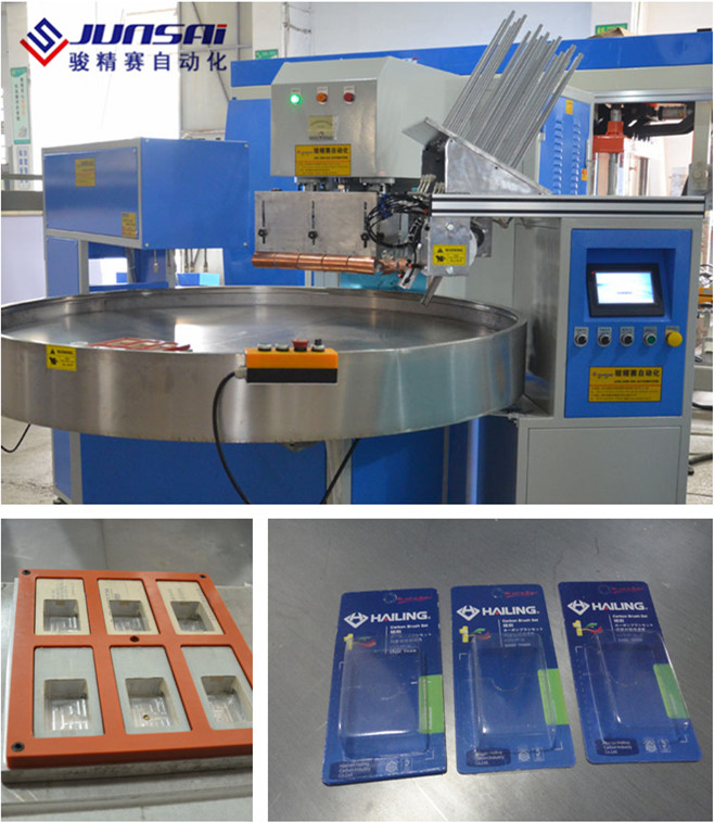 2. 用于吸塑包装封口的高周波机器,使用时可根据吸塑包装的产品尺寸大小,来决定一次同时包装一个或多个产品。工作台自动旋转,3-6工位可选择,工作效率更高。